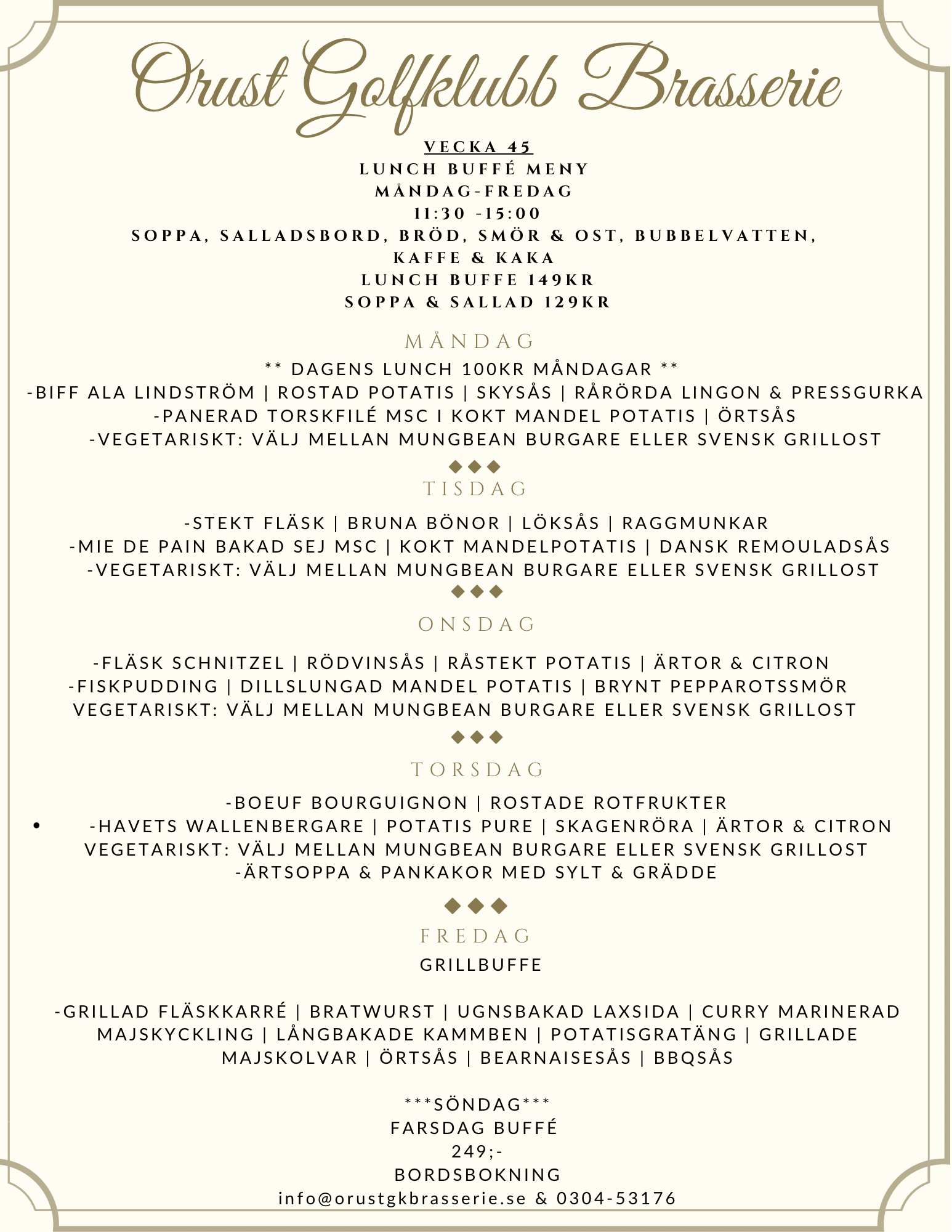 ORUST GOLFKLUBB BRASSERIE VÅRAN VISION Välkommen in Ring oss 0304-53176 Maila oss info@orustgkbrasserie.se VECKANS LUNCHMENY Vecka 45 LUNCHBUFFÉ MENY Ala carte meny Catering & event VI SKRÄDDARSYR ALLTID CATERING EFTER ERA BEHOV OCH ÖNSKEMÅLOAVSETT OM DET ÄR CARINAS FANTASTISKA SMÖRGÅSTÅRTOR OCH LANDGÅNGARELLER HELHETSLÖSNINGAR VID ERA OLIKA SAMANKOMSTER MED ELLER UTAN PERSONAL PÅ PLATS HOS ER ELLER HOS OSS I VÅRA LOKALERVI HAR IDAG BLIVIT ETT SJÄLVKLART ALTERNATIV ÄVEN NÄR DET GÄLLER CATERING PÅ BÄSTKUSTEN. Kontakta oss Hitta hit Skicka ditt medelande Har du frågor om vår mat? Vi är här för att hjälpa, kontakta oss idag Please enable JavaScript in your browser to complete this form.Please enable JavaScript in your browser to complete this form.Namn *E-post *MeddelandeSkicka